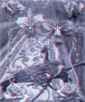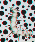 The 3D images on this pages can be viewed with the 3D glasses that are provided at the back of the book. Make sure you are seeing through the cyan lens with your right eye and the red lens with your left eye.