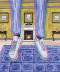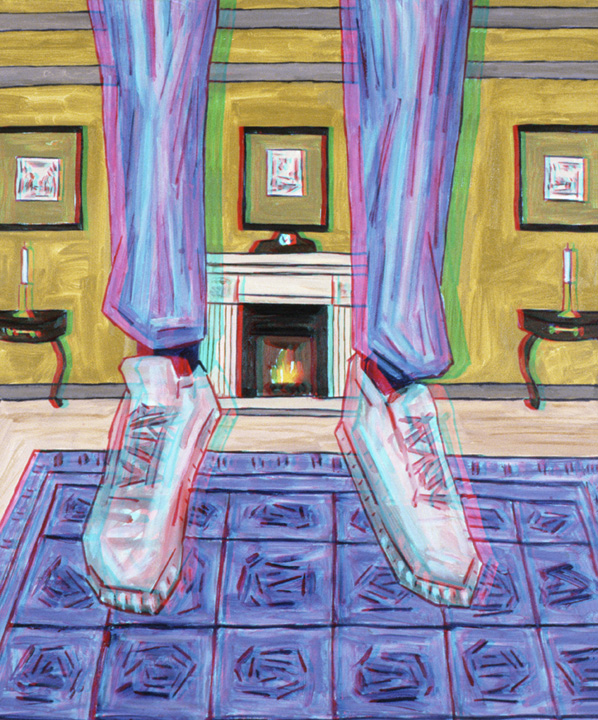 but as a luxurious mansion. The dangling feet in the foreground imply a