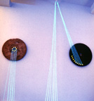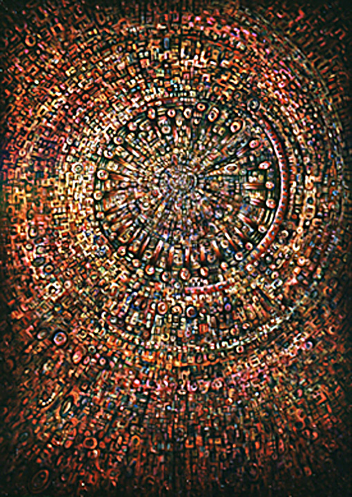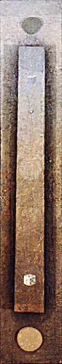 "In my paintings, collages, and reliefs, I use elements including wooden wheels, stones, earth, small video monitors, cut-up phone books, and holograms. For me, they represent our personal search for identity in a multicultural and multimedia world. My compositions are very abstract, but the components and details are realistic."