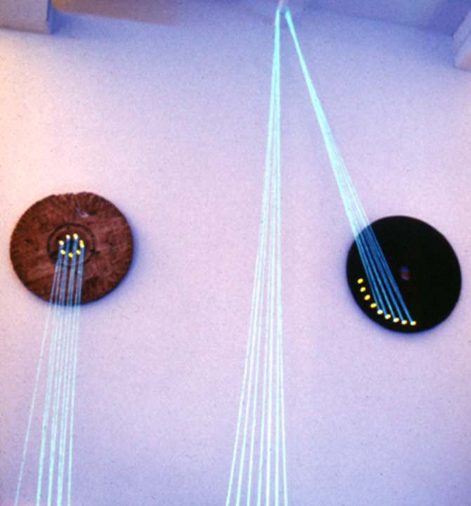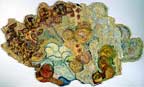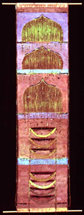 "The Unweavings® process I have developed is a unique method of working with canvas, evoking a spirit of mystery and celebration in the oldest tradition of intensely handcrafted textiles. The beads form a rhythmic counterpoint to the unraveled strands, and are prayers and marking points."