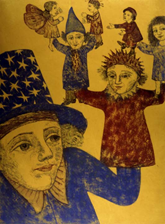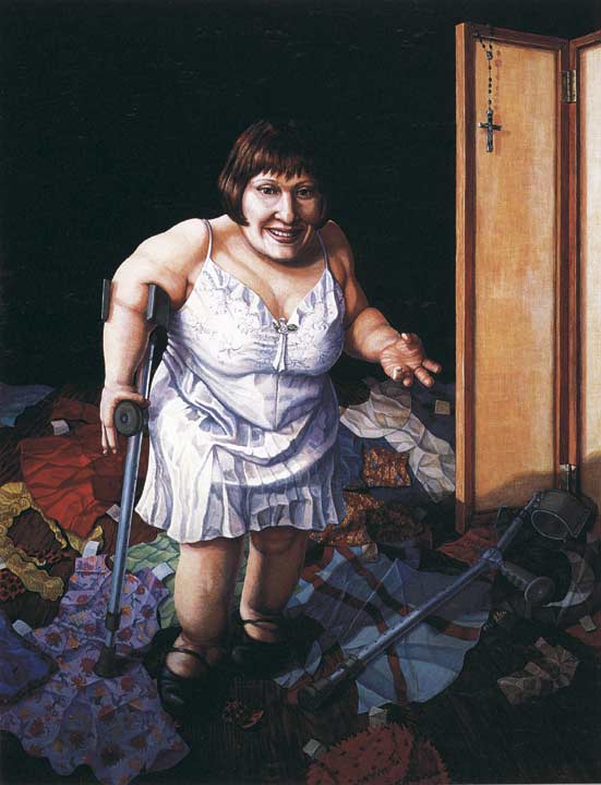 "The paintings that make up Circle Stories are portraits of well-established artists in a variety of fields, including theater, dance, writing and visual arts. Each artist has a significant physical disability and an interest in exploring body issues in his or her work. Tekki Lomnicki is a performing artist and writer. Her work uses her costumes to explore, parody and manipulate the ways that small stature is perceived."