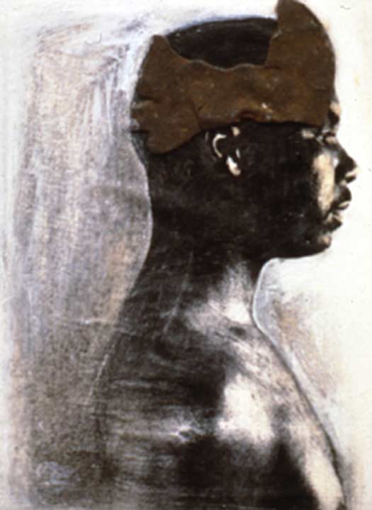 "This body of mixed media work contains self-portraits, incorporated with found objects that literally and symbolically balance on the figure's head like 'Helmets and Crowns'. These symbolic helmets and crowns began from an observation of women's hairstyles and other culture's use of objects for head adornment and symbols of one's status in society. It is my intention for the viewer to become at once disconcerted by the balance of objects on one's head and re-examine the discarded objects used for the collages."
