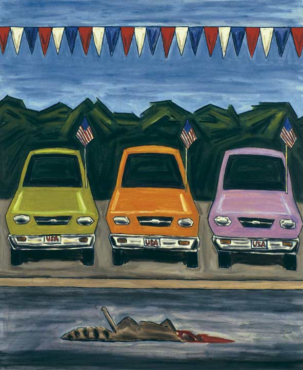 "The pattern here implies unanimity. All the flags and signs enhance the connection between this country and the greatest expression of its lifestyle: the automobile. But in the street lies some of the collateral damage of that lifestyle, the contrast tempering the enthusiasm with a broader perspective."