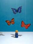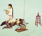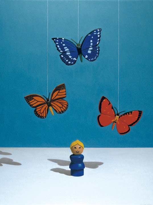 "Opera is considered one of the highest forms of expression and certainly one of the most haughty. This painting is a reference to Pucini's famous opera, Madame Butterfly. The use of toys in the image blurs the line between high and low culture. The highly decorative sensibility of the image, however, creates a beauty similar to that of the opera. The image pokes fun at this highest form of art while aspiring to its loftiness."