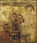 "This portrait was inspired by the events of September 11. I aimed to fuse Christian and Muslim together in a single, nonviolent image. I recalled the ubiquitous blue robe of the Virgin Mary by coloring Muslim Madonna's veil blue."