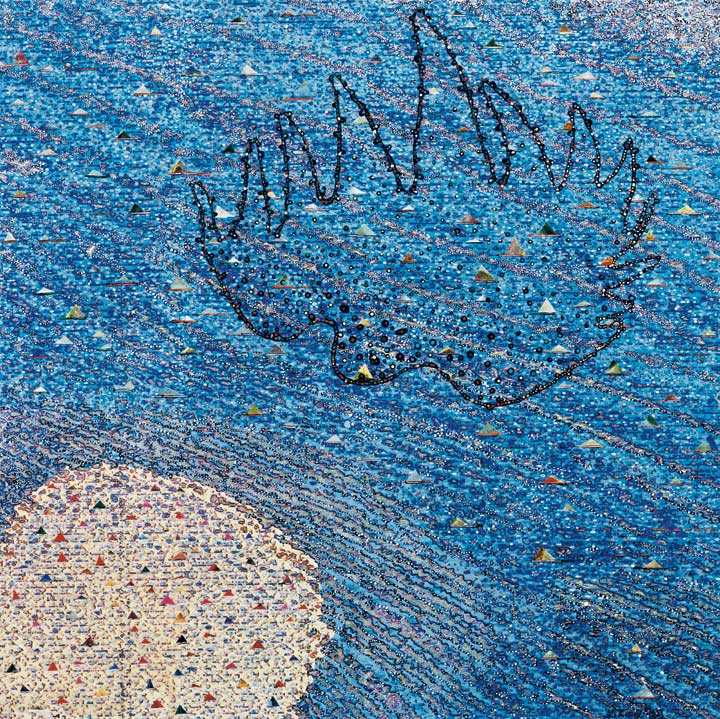 "Producing obsessive and hypnotic surface is my way to engage the viewer in an ongoing visual dialogue with my artwork. The dark Icarus wing-like form is shown hovering over a sea-like surface. The image depicts a moment of perfection before his fall."